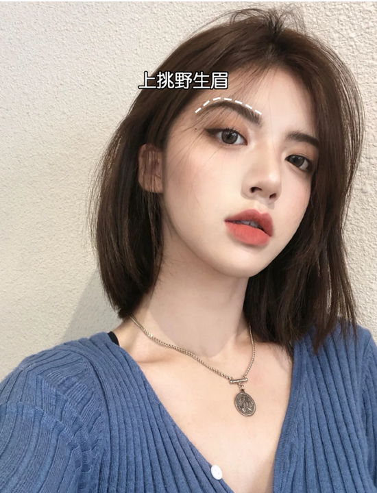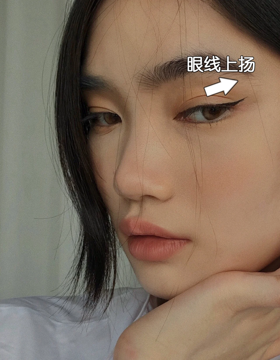 从眉毛开始,要营造骨骼脸的氛围,就得画出眉毛上挑的趋势,上挑野生眉是精髓。