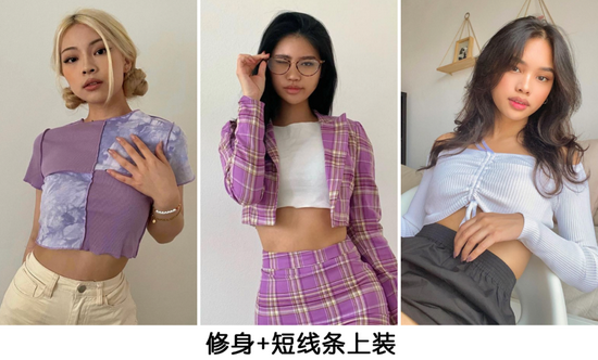 比如修身+短线条的上装,把上半身的线条修饰地干净利落,还能适当露肤增加俏皮感。